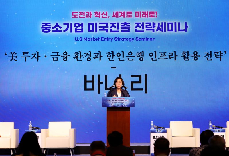 한미은행 바니 이 행장이 지난 24일 제주 서귀포시 롯데호텔에서 한국 중소기업중앙회 주최로 열린 2025 중소기업 리더스포럼에 참석, 미국 진출 전략 세미나에서 주제 발표를 하고 있다.