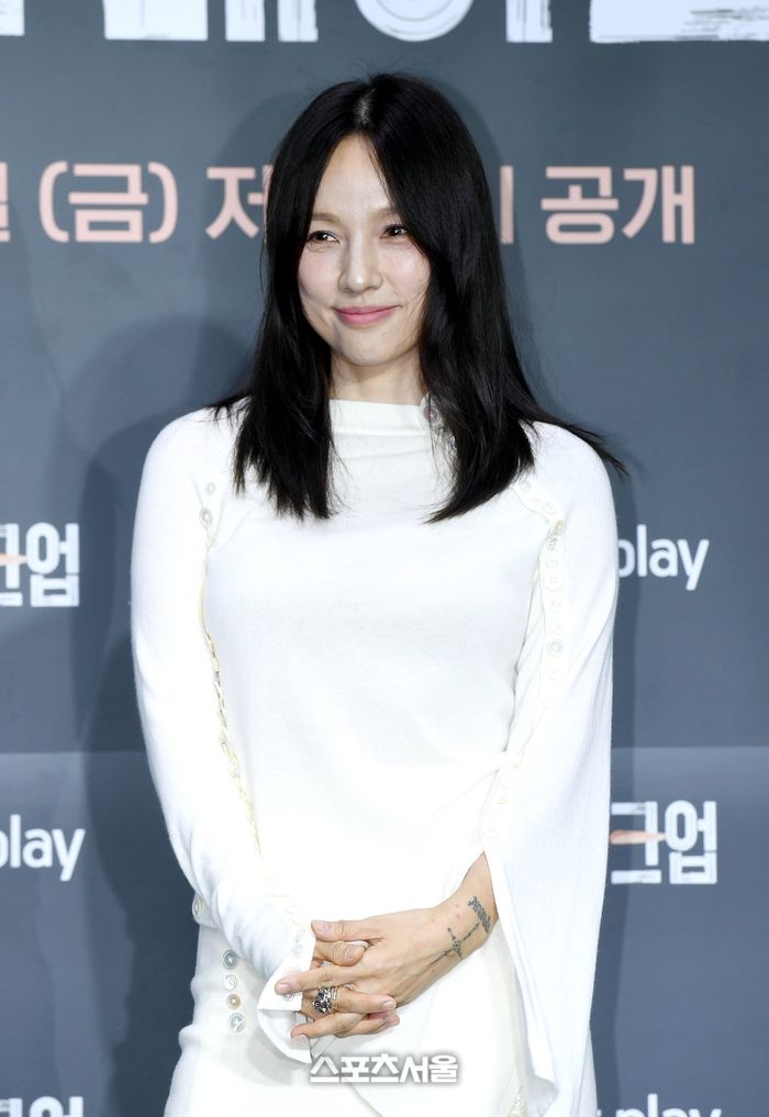 가수 이효리가 1일 서울 광진구 풀만 앰버서더 이스트폴 호텔에서 진행된 쿠팡플레이 ‘저스트 메이크업’ 제작발표회에서 취재진을 향해 포즈를 취하고 있다.
