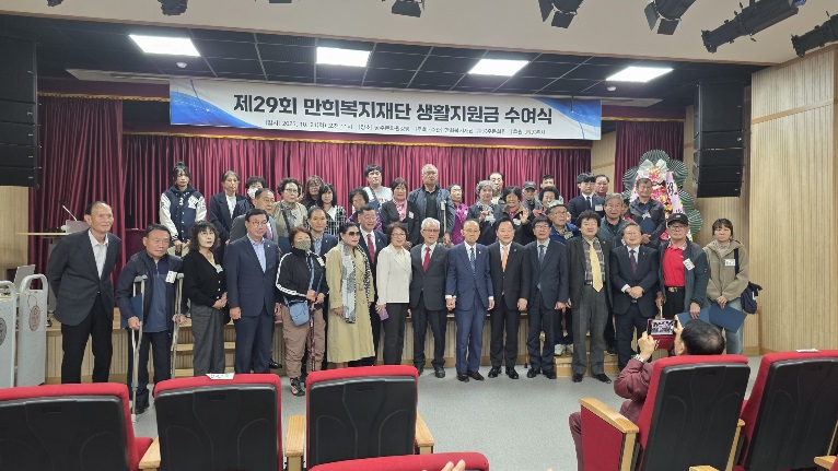만희복지재단(이사장 박형만)이 주최하는 릫제29회 생활지원금 수여식릮이 21일 한국 충남 공주문화원 강당에서 열렸다. 재단 측은 이날 공주시가 추천한 독거노인, 소년소녀가장, 장애인 등 50명에게 100만원씩의 생활지원금을 전달했다. 재단은 올해 행사까지 총 6억2655만원을 지원했다. 박형만(앞줄 가운데) 이사장을 비롯해 행사 참석자들이 기념촬영을 하고 있다