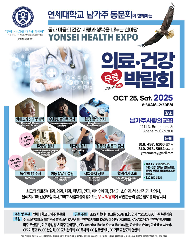 연세대 남가주동문회(회장 이원모)는 오는 25일 오전 8시30분부터 오후 2시30분까지 남가주 사랑의교회(1111 N. Brookhurst St., Anaheim)에서 ‘2025 연세 의료·건강 박람회’를 개최한한다.