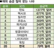 한국은 전년보다 2억달러 정도 감소한 75억달러로 28위를 차지했다.