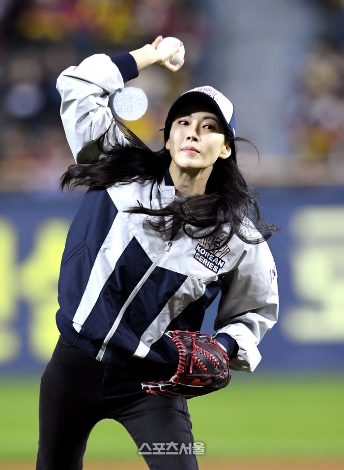 배우 김소연이 27일 잠실구장에서 열린 2025 KBO리그 한화와 LG의 한국시리즈 2차전에 앞서 시구를 하고 있다. 2025. 10. 27.