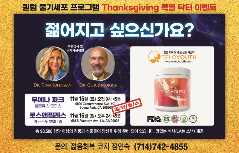 건강한 노화를 돕는 줄기세포 활성화 프로그램을 소개하는 텔로유스(Teloyouth) 닥터 초청 세미나가 다음달 남가주에서 열린다.