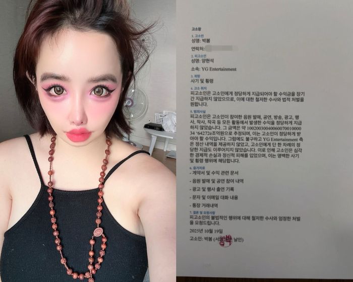 앞서 박봄은 22일 ‘고소인 박봄, 피고소인 양현석’이 적힌 고소장을 갑작스레 올린 바 있다. 해당 고소장을 통해 박봄은 “피고소인은 고소인에게 정당하게 지급되어야 할 수익금을 장기간 지급하지 않았으므로, 이에 대한 철저한 수사와 법적 처벌을 원한다”고 주장했다.